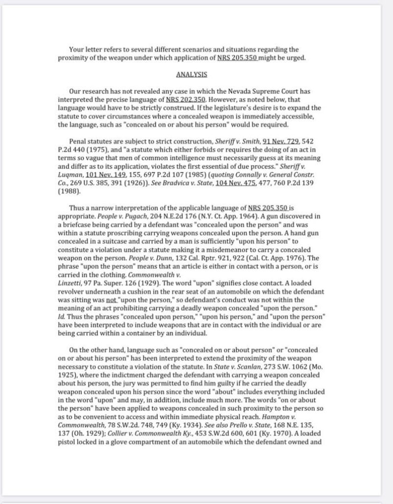 In addition to the NRS – Nevada Revised Statute, we also add the opinion of this letter from the NV Attorney General. We present this letter to our Students, thanks to our friends at NevadaCarry.Org